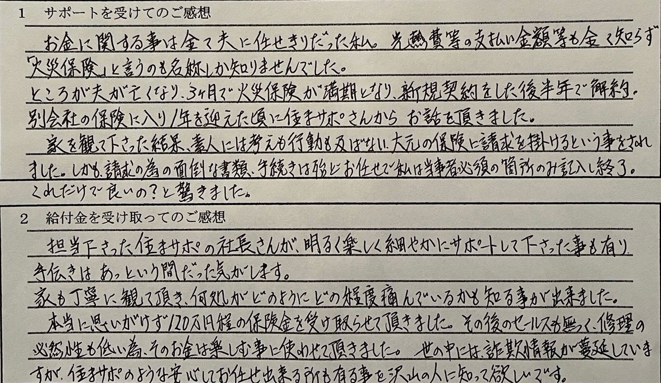 通常のサポートは、創業時から弁護士監修のもと法律法令に則ったサービスを提供しており、これまで法的に保険会社・行政・お客様とのトラブルは1度もございませんが、法律の関係で弊社がお客様の代わりに代理申請等は出来ませんので、保険会社への請求や窓口はお客様となります。